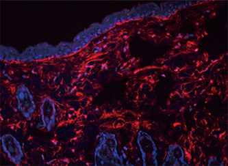 蛍光標識(Cy3)プラスミドDNAが効率的に細胞内へ取り込まれ、核への移行が行われていることが示唆される(ピンク色の顆粒様蛍光がプラスミドDNAが導入された細胞核)