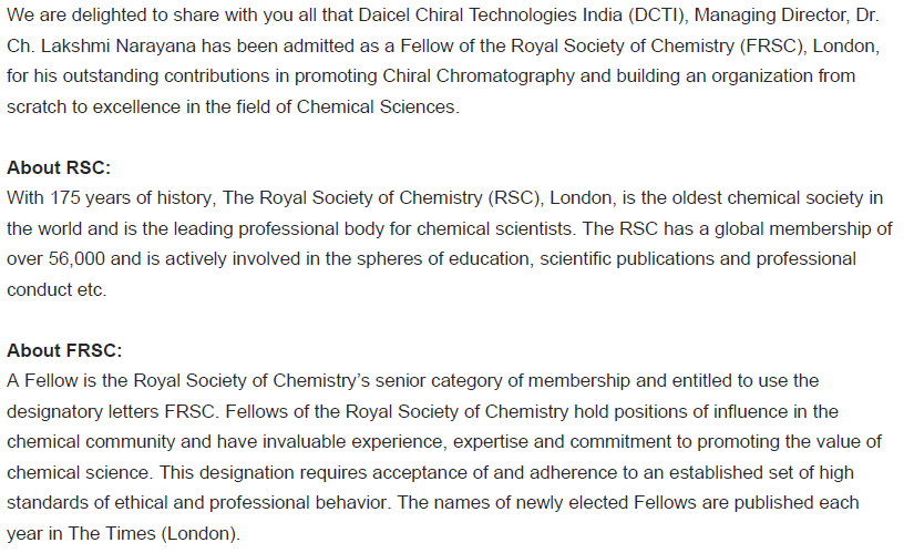 Daicel Chiral Technologies (India) Pvt. Ltd.Dr. Ch. Lakshmi Narayana