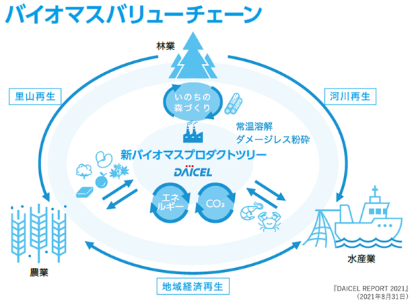 当社は会社、業界の壁を越えて、理念を共有しながら共に価値創造できる仲間をつくることを目指しています。知財/無形資産投資という側面においては理念を具現化する共同開発を積極的に行っています。その一つとしてバイオマスバリューチェーンの実現に向けた取り組みがあります。「サステナブル経営方針」に沿って第四次長期ビジョン「DAICEL VISION 4.0」を策定し、人々に幸せを提供する価値ある製品を、ヒトや地球にやさしい方法で生産する技術を開発・発展させることで、持続可能な社会の実現に貢献することを目指しています。その中で、ダイセルが長年扱ってきたセルロースをはじめとする脱石油につながる天然由来資源の有効活用(新バイオマスプロダクトツリー)を推進しています。