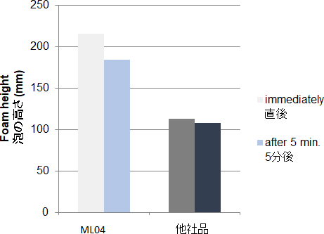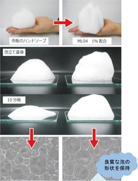 PGLAL ML04を配合することで、気泡力と泡の安定性を向上させます。ハンドソープ処方にPGLAL ML04を1%配合することで、気泡力と泡の安定性が向上しました。