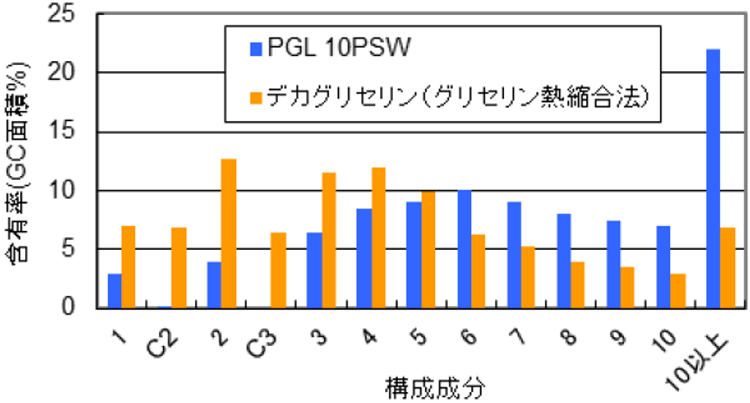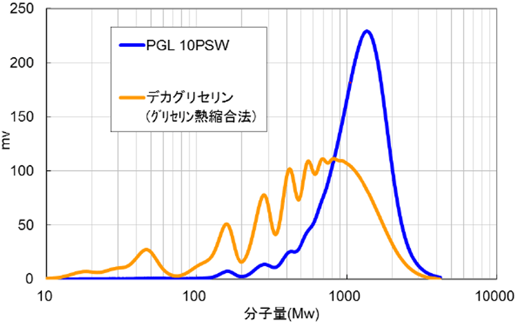 弊社PGLはグリセリン熱縮合法品と比較し、分子量分布が狭く、環状化合物の含有量が少ないことが下記分析から確認できます。