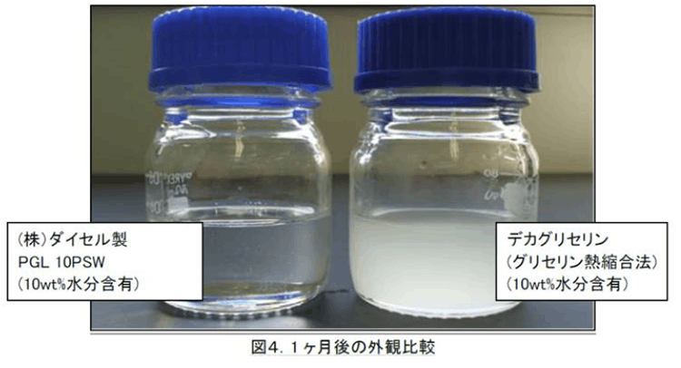 - ダイセルのPGLは当社の独自の製法で製造し製おりますが、同重合度のグリセリン縮合法で製造されたPGLと比較して環状化合物が少ないため、無色・透明かつ完全水溶します。