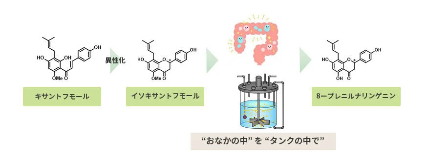 株式会社ダイセル(本社:大阪市北区、代表取締役社長 小河義美)は、ホップに含まれるフラボノイド※2「キサントフモール」の腸内代謝物※3である機能性食品素材「ホップ抽出発酵物」(製品名:アストロホップ®)の販売を開始しました。アストロホップ®の機能性成分である「8-プレニルナリンゲニン」は全身に循環し、継続摂取することで組織に蓄積されて機能性を発揮する成分です。