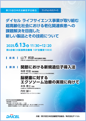 株式会社ダイセル(本社:大阪市北区、代表取締役社長:榊 康裕)は、2025年6月13日から15日にグランキューブ大阪(大阪国際会議場)で開催される第25回日本抗加齢医学会総会にてランチョンセミナーを共催いたします。セミナーでは、当社の新規投与デバイスを用いた関節における新しい遺伝子導入法と、当社が開発した全自動単離システムによって得られたエクソソームの脳梗塞治療に対する有用性についてご紹介いたします。
