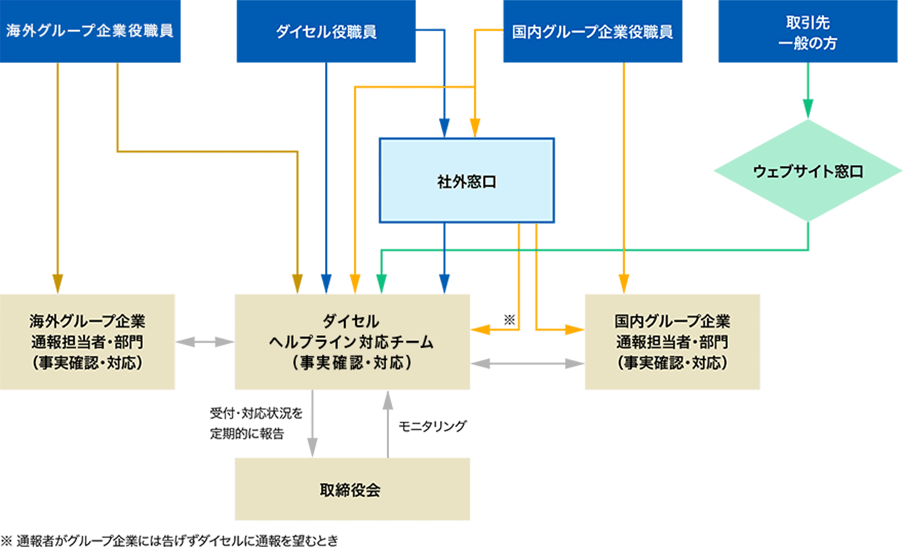 また、グループ企業においては、役職員が当社に直接、報告・相談できる体制に加え、それぞれの企業内にも独立した通報窓口を設置し、これらを併用することでより広く役職員の声を集めるようにしています。